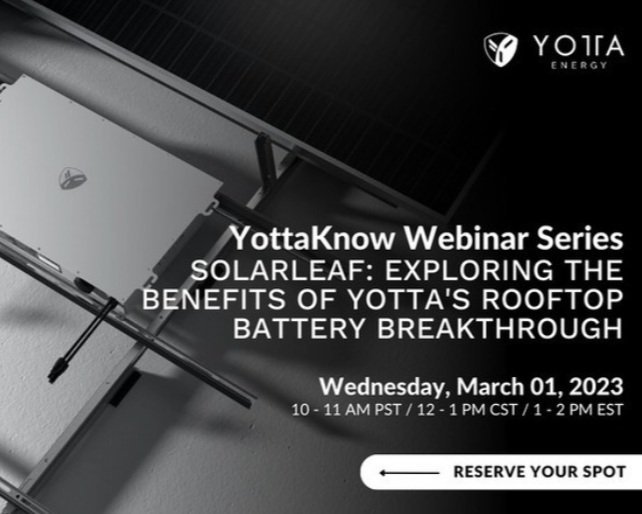 Join us, on Wednesday, March 1, for our "SolarLEAF: Exploring the Benefits of Yotta's Rooftop Battery Breakthrough" webinar, presented by Ryan Davies and Chris Barrett.
